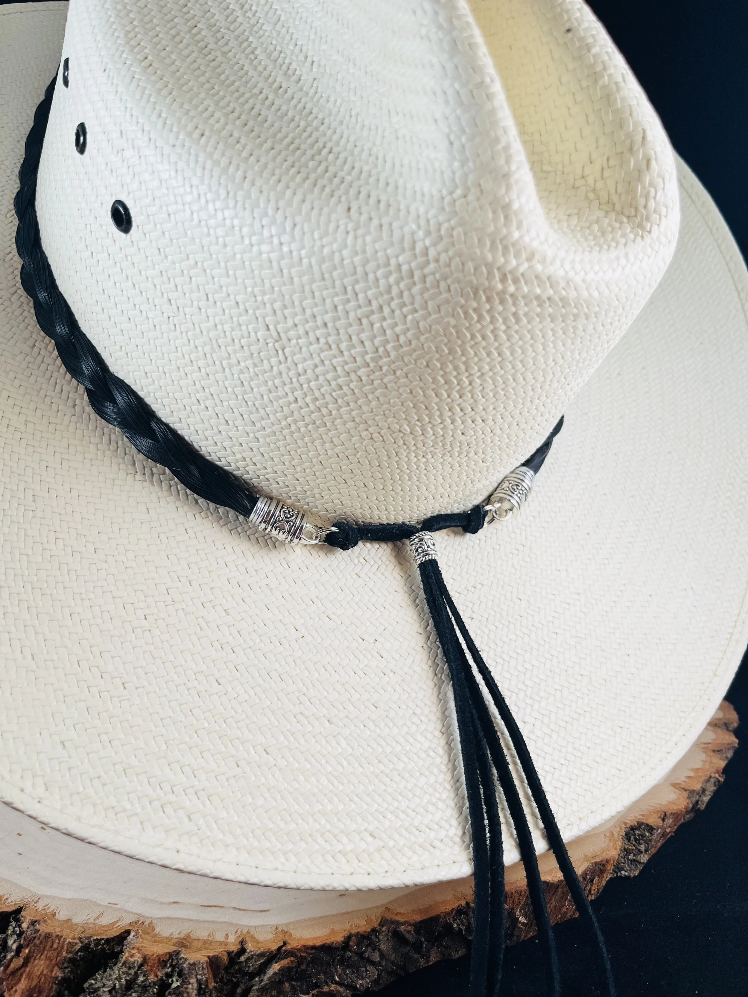 Adjustable double four strand round braid hat band with unique knot and tassels.