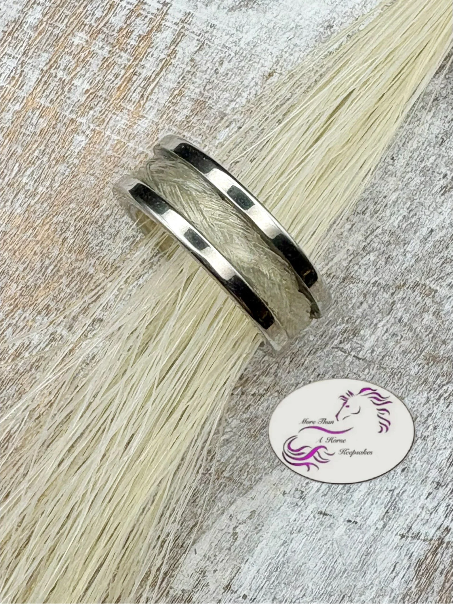 This is a very special wedding band created from horsehair. The horsehair is inlaid into a beautiful titanium ring!! The horsehair hair was from the man’s horse.