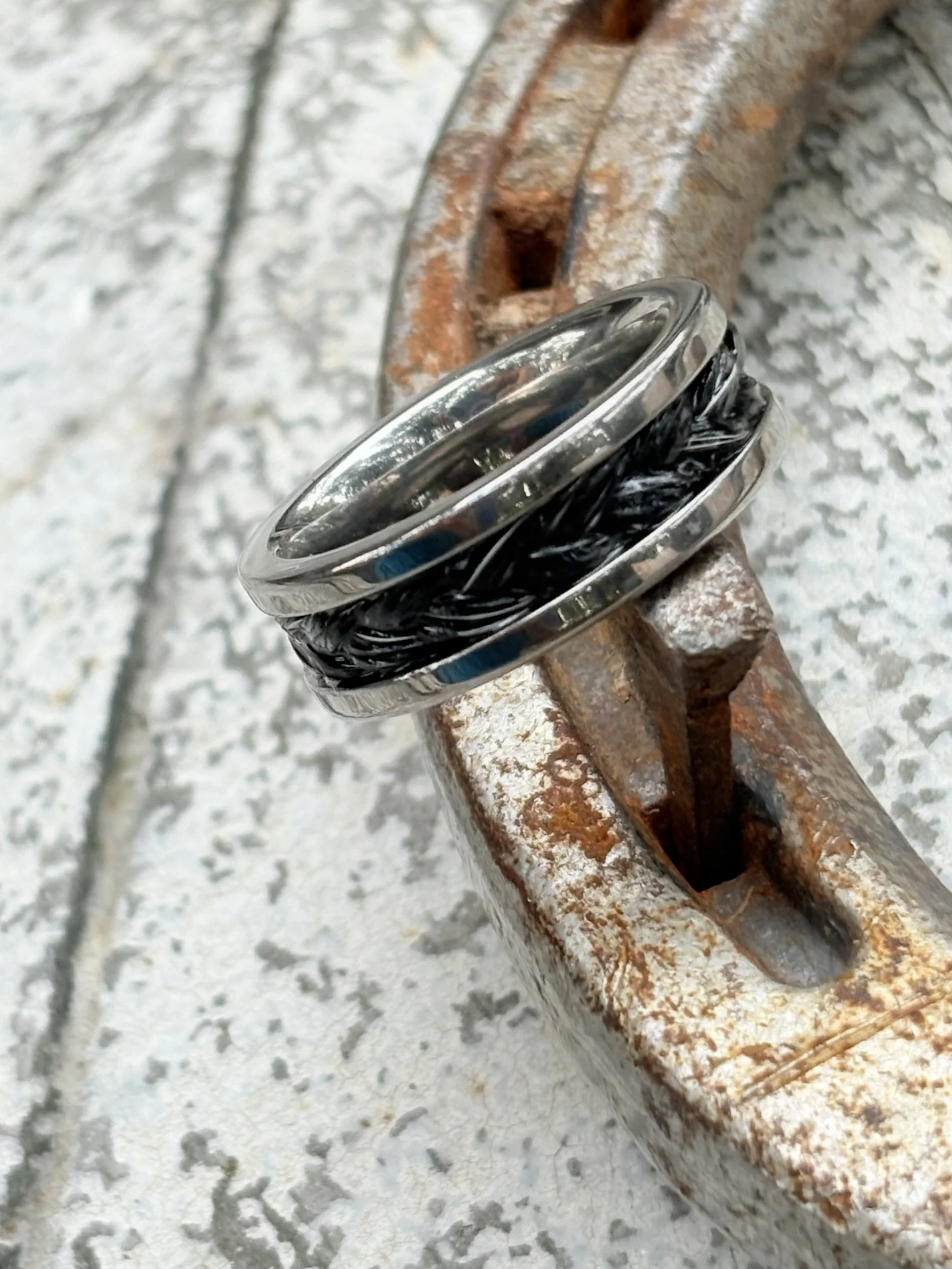 This is a very special wedding band created from horsehair. The horsehair is inlaid into a beautiful titanium ring!! The horsehair hair was from the man’s horse.