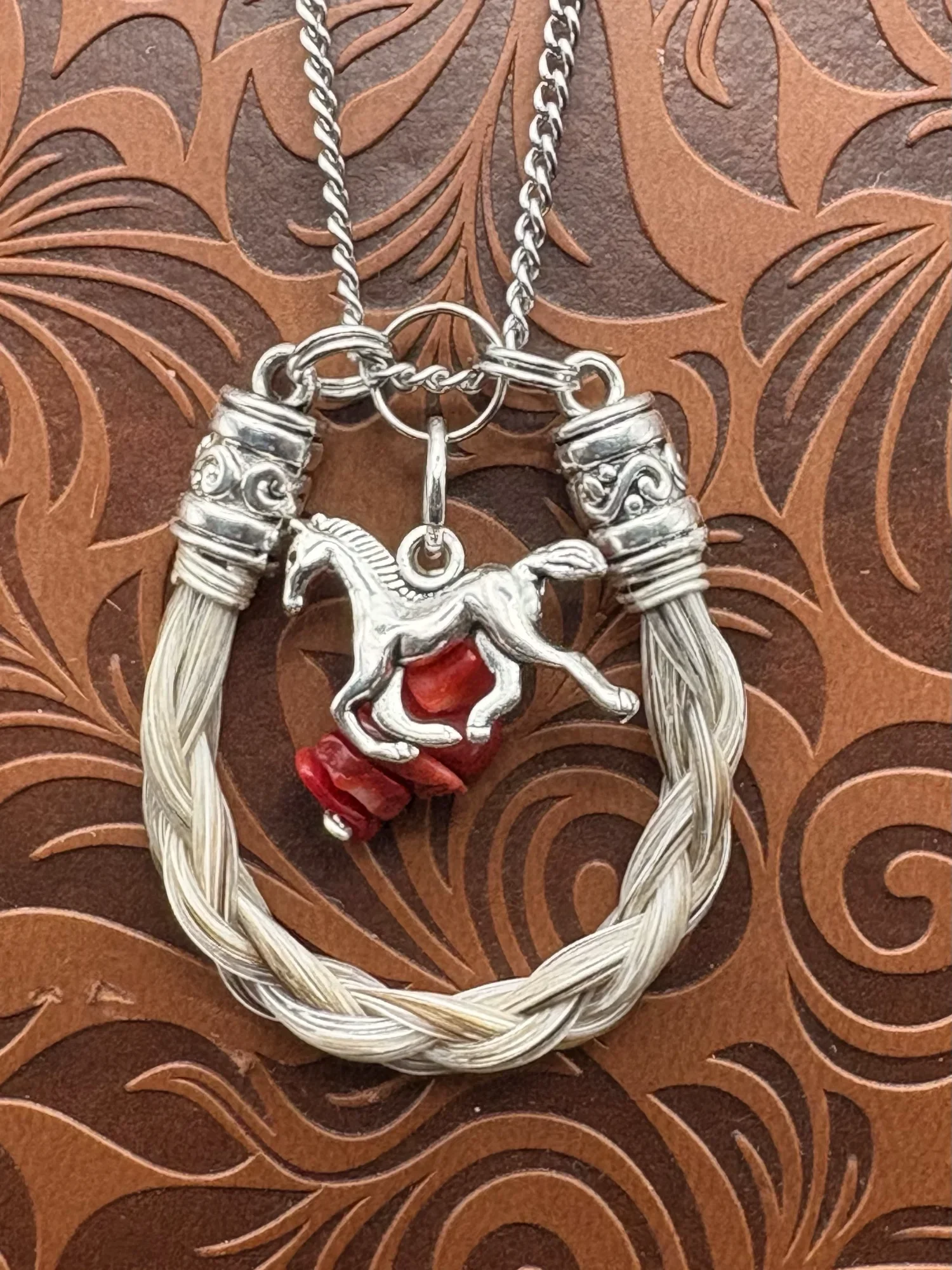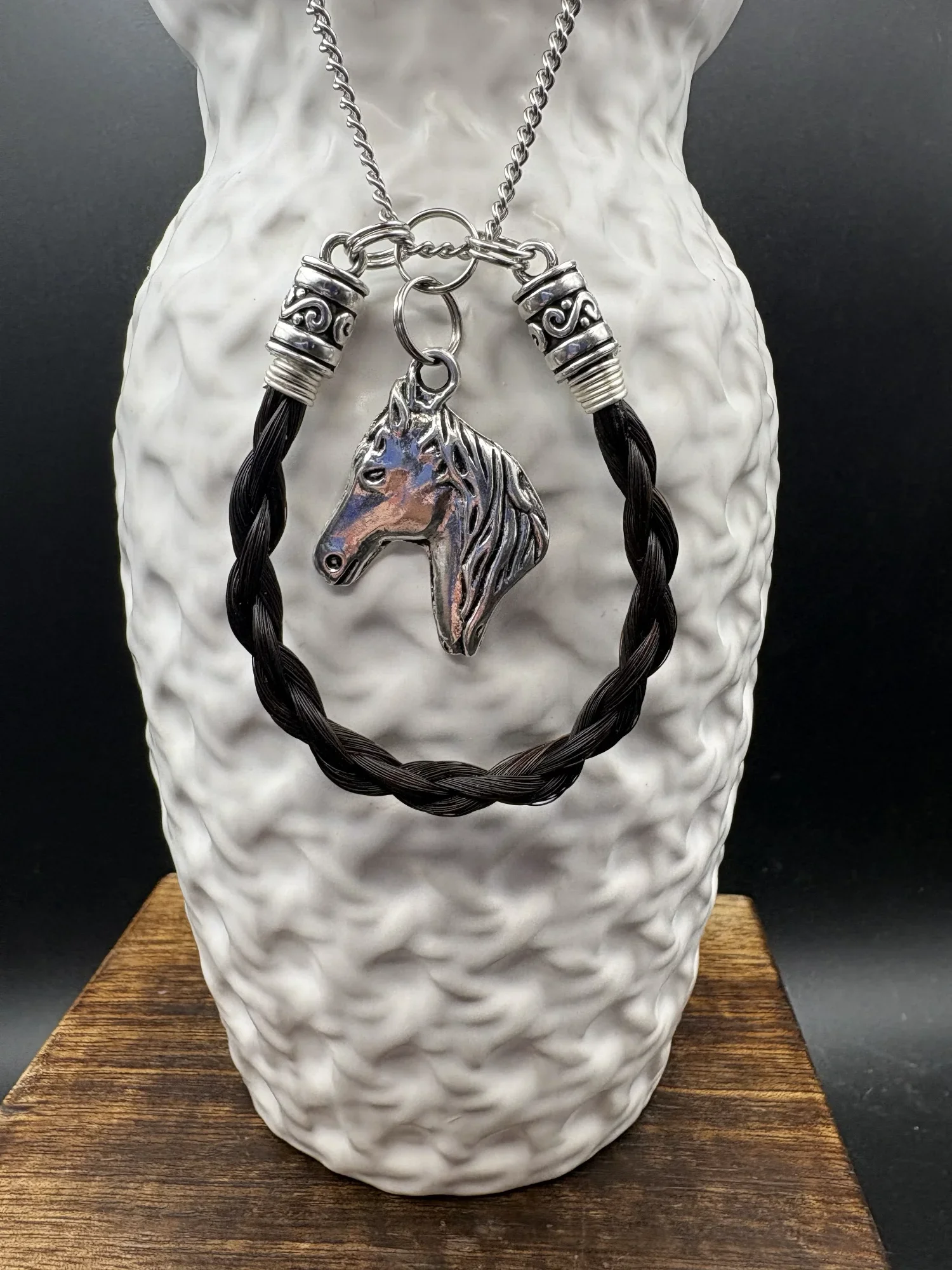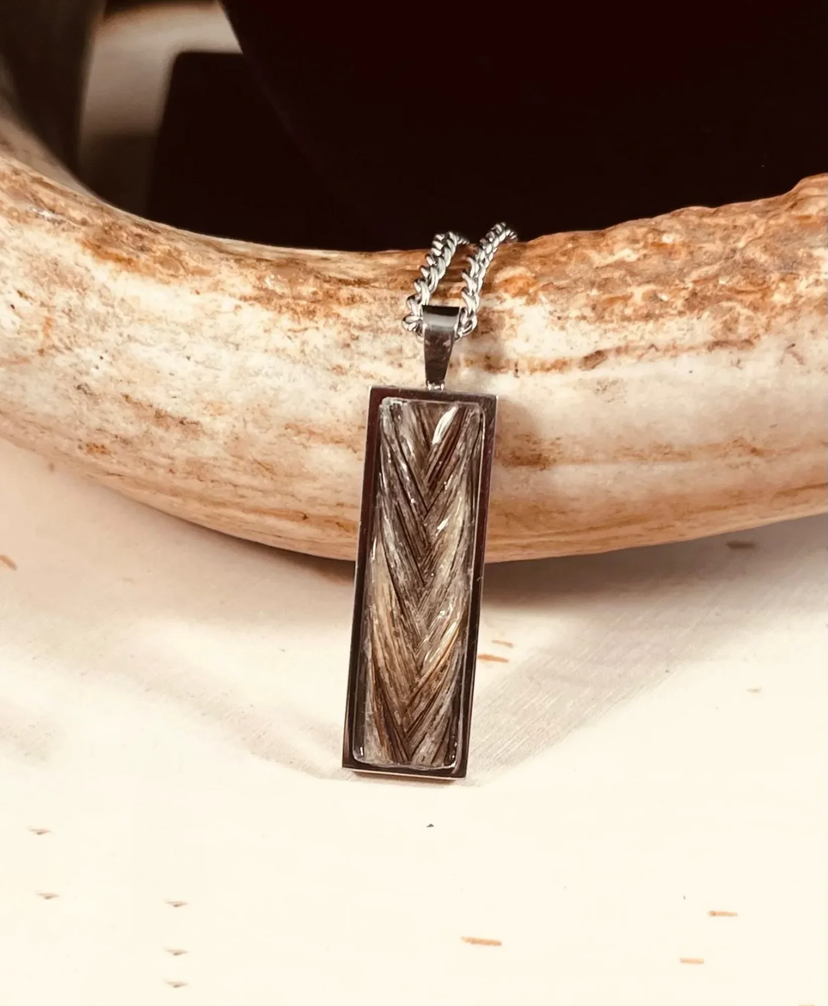 We offer four distinct necklace designs to beautifully display your horse’s unique mane or tail hair. Choose from a braided horseshoe pendant, a braided tassel style, or two bar pendant styles. Each design is thoughtfully crafted and finished with a standard necklace chain, allowing you to select the pendant style that best reflects your personal connection.